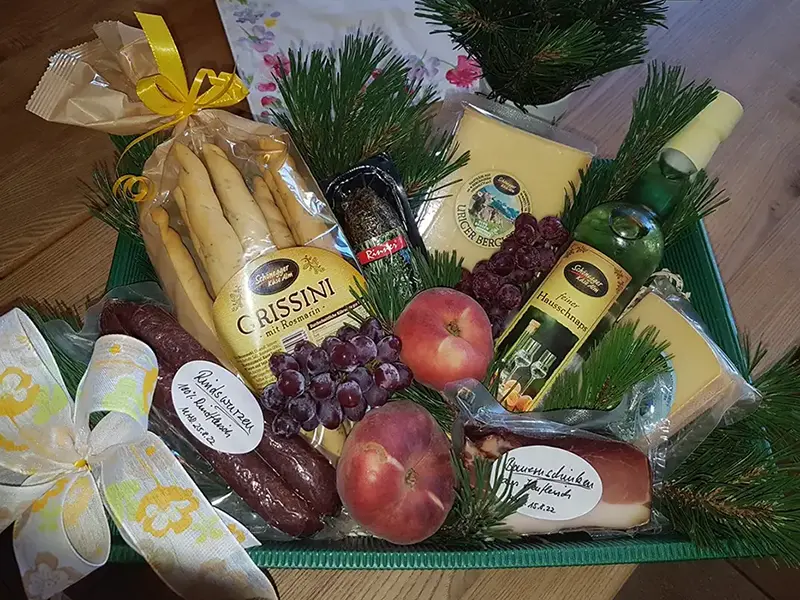 Außerdem erhalten Sie von uns schön dekorierte und geschmackvolle Käse- und Wurstplatten sowie Geschenkkörbe auf Vorbestellung.
